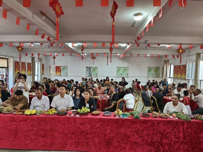 工作队副队长蔡永亮向村民介绍中秋节和农民丰收节来历,鼓励村民珍惜来之不易的丰收成果,争取明年再接再厉取得更好的收成。乡领导和村干部也纷纷送上美好节日祝福。