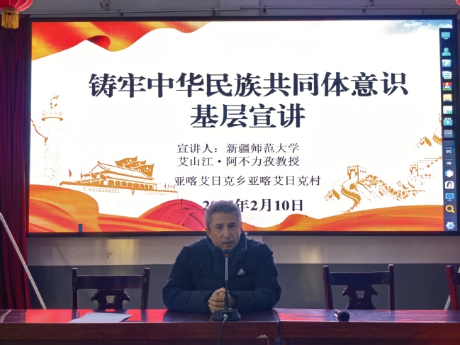 2月10日,永利官网驻莎车县亚喀艾日克村工作队特邀永利官网历史与社会学院教授艾山江·阿不力孜到村开展“铸牢中华民族共同体意识”主题宣讲活动。村“两委”成员、党员、群众等300余人参加。