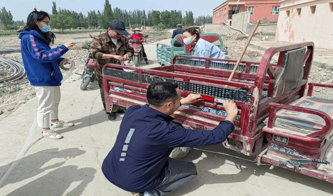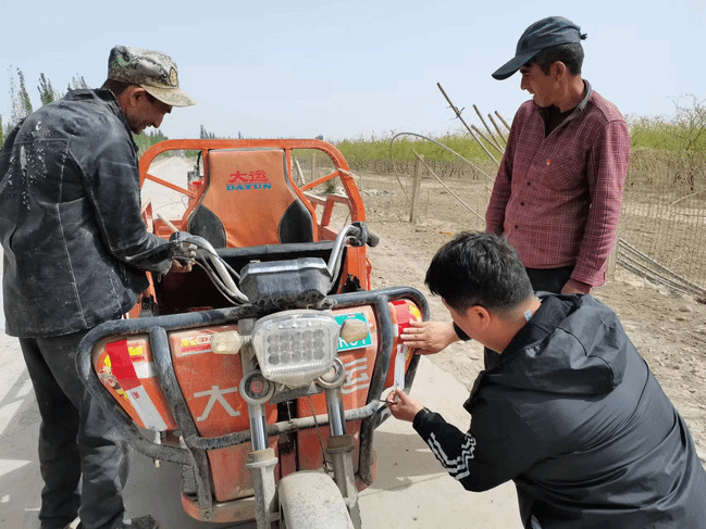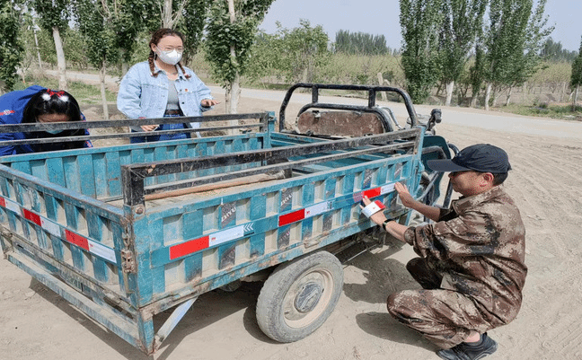 近期,孜热甫夏提(3)村一村民的电动三轮车由于没有贴反光贴,发生了一起交通安全事故,工作队高度重视。工作队队长拜晓旭、队员张振波、吐尔逊江·吐尔汗坚,连夜入户向村民讲解贴反光贴的重要性,与工作队员为村民的电动车贴上了反光贴。为防止村民交通安全事故的再次发生,工作队通过宣讲、入户走访不断向村民讲解日常交通不安全行为,如驾乘车辆不系安全带、骑乘摩托车和电动自行车不佩戴头盔等,向村民敲响安全警钟,引导村民切实增强交通安全意识,提高防护意识,并落实在日常生活小事中。
