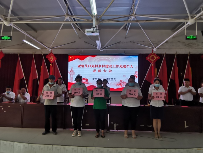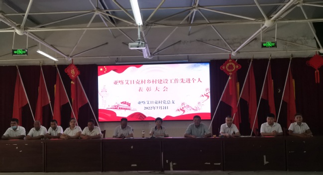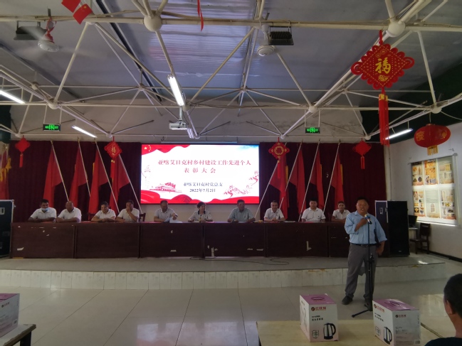 村党支部书记、村委会主任库尔班·阿尤普宣读《亚喀艾日克村党总支关于对2022年乡村建设工作先进个人的表彰决定》,对民族团结先进个人8名,防沙植树绿化先进个人39名,村委会驻地改造先进个人25名,示范引领先进个人4名,养殖带头人5名等81名先进个人进行了表彰。